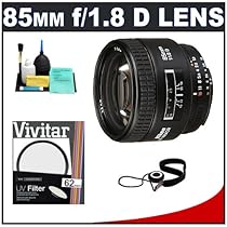 Find discount price for Nikon 85mm f/1.8D AF Nikkor Lens + UV Filter + Accessory Kit for Nikon D3, D3x, D300, D60, D5000, D90, D7000, D300s, D3000 & D3100 Digital SLR Cameras Perfect for digital, video and photo Kit includes: ♦ 1) Nikon 85mm f/1.8D AF Nikkor Lens ♦ 2) Vivitar 62mm UV Glass Filter ♦ 3) CapKeeper 2 Lens Cap Strap ♦ 4) Precision Design Deluxe 6-Piece Lens & Digital SLR Camera Cleaning Kit The Nikkor 85mm f/1.8 D Autofocus lens is a compact and portable telephoto lens that is ideal